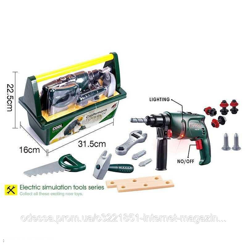 У комплекті є все необхідне для маленького майстра: шуруповерт, пилка, гайковий ключ, молоток, болти, гайки та деталі для збирання. Шуруповерт автоматично обертається, має підсвічування й реалістичний вигляд, що робить гру ще цікавішою.